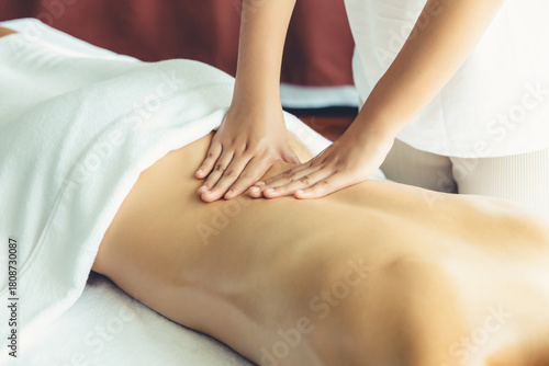 Caucasian woman customer enjoying relaxing anti-stress spa massage and pampering with beauty skin recreation leisure in day light ambient salon spa at luxury resort or hotel. Quiescent