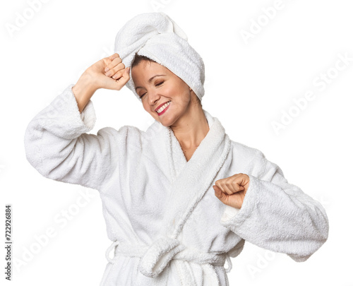Caucasian woman in bathrobe and towel celebrating a special day, jumps and raise arms with energy.
