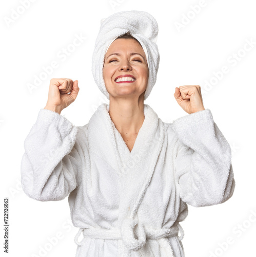 Caucasian woman in bathrobe and towel celebrating a victory, passion and enthusiasm, happy expression.