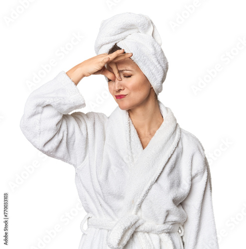 Caucasian woman in bathrobe and towel having a head ache, touching front of the face.