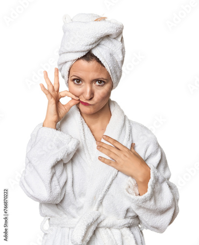 Caucasian woman in bathrobe and towel with fingers on lips keeping a secret.