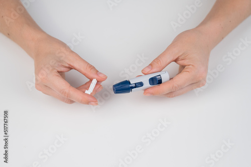 woman, needle, into, lancet, pen, put, health, equipment, diabetic, blood, hypoglycemia, disease, insulin, glucose, hospital, measure, level, medicals, meter, mobile, object, crayons, pin, protection, sterile, test, tool, sugar, caucasian, faceless, cropped, closeup, hand, sick, problem, disease, check, finger, female, care, health care, device, glycemia, using, medicine, analysing, instrument, control, diagnosis