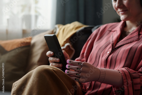 Caucasian young adult woman with prosthetic hand sitting on sofa using smartphone smiling, demonstrating gadget addiction and modern technology integration in daily life