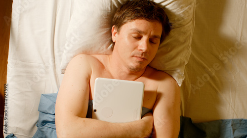people, adult, young, cyberspace, addiction, addict, pad, ipad, tablet, sleep, lay, bed, caucasian, white, human, man, social, online, communication, portrait, face, head, closed eyes, photogenic, cute, hair, brown, one person, lying, relax, rest, pillow, cushion, computer, mobile, digital, naked, skin, home, indoor, evening, topview, from above, male, interior