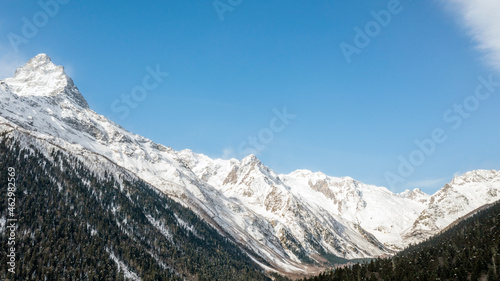 Caucasus Mountains, Panoramic view of the ski slope with the mountains Belalakaya, Sofrudzhu and Sulakhat on the horizon in winter day. Dombai ski resort, Western Caucasus, Karachai-Cherkess, Russia.