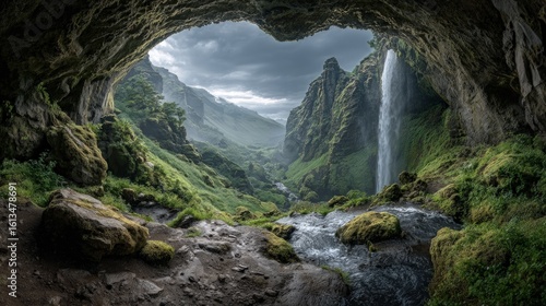 cave, waterfall, vale, landscape, iceland, nature, green, mountain, scenic, view, water, rock, moss, plant, lush, gorge, dramatic, sky, cloud, nubes, hole, travel, journey, exploration, adventure, tour tourism, hidden, wild, rocky, fresh, flowing, misty, photo, beautiful, peaceful, vigorous, remote, powerful
