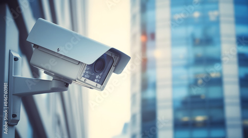 CCTV security camera in a city with business building on background