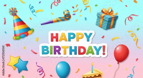 birthday, celebration, party, gift, hat, balloon, confetti, streamer, whistle, cake, candle, star, joy, happiness, festive, occasion, gathering, friends, family, special, day, surprise, wish, fun, excitement, decoration, invitation, present, treat, sweet, colourful, bright, vibrant, theme, childhood, adult, memory, tradition, greeting, wishes, laughter, music, dance, cheer, moment