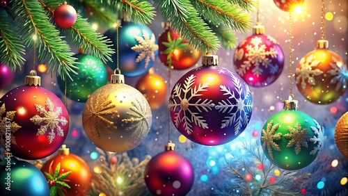 Celebrate the holidays with a festive art background featuring bright ornaments and snowflakes, ideal for spreading joy