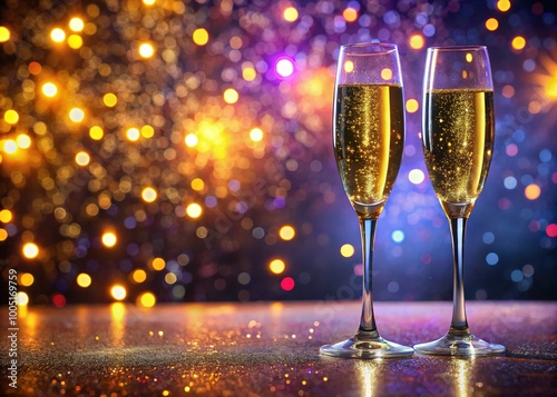 Celebrate with festive champagne flutes brimming with sparkling bubbly, elegantly placed on a glittery table, creating a perfect setting for joyful moments and memories.