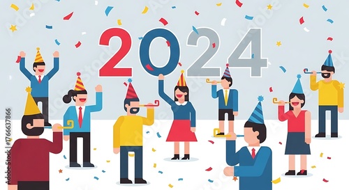 celebration, new year, 2024, party, festive, joy, people, confetti, hat, illustration, greeting, event, holiday, year, occasion, happiness, togetherness, fun, excitement, gathering, welcome, future, hope, cheer, tradition, midnight, countdown, resolution, start, beginning, anniversary, ceremony, culture, decoration, design, element, graphic, icon, symbol, vector, artwork, background, card, concept, creative, drawing, emblem, entertainment