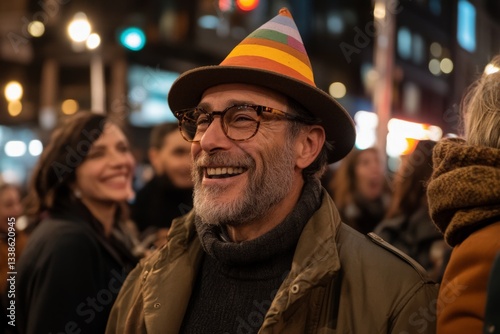 celebration, night, joyful, urban, party hat, rainbow, friends, smiling, crowd, festive, happiness, city lights, excitement, gathering, fun, nightlife, social, togetherness, laughter, camaraderie, diversity, event, costume, enjoyment, entertainment, community, people, festivity, tradition, sight, sound, colours, atmosphere, joy, friendship