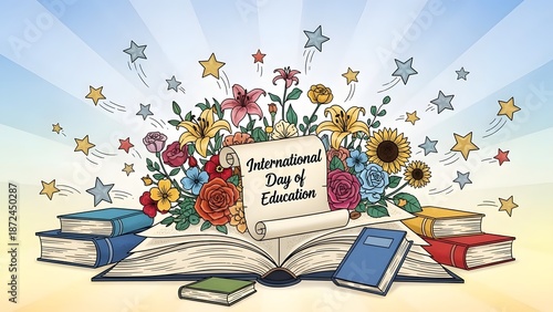 Celebration of Education: A vibrant illustration celebrating International Day of Education, with open books, flowers, and stars symbolizing the transformative power of learning.