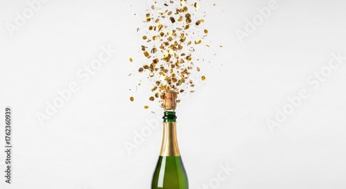 celebration, explosion, gold, festive, cheer, bubbly, delight, sparkling, moment, toast, new year's eve, congratulation, anniversary, triumph, success, joy, bottle, champaign, alcohol, drink, cork, confetti, gold, white background, occasion, event, closeup, beverage, fun, holiday, luxury, greeting, nobody, studio shot, freshness, fizzy, glistering, elegant, gathering, promotion, achievement, excitement, wishes