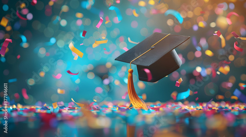 graduation, celebration, confetti, joy, cap, gown, tassel, excitement, success, achievement, milestone, academic, ceremony, happiness, accomplishment, colourful, festive, student, education, diploma, school, university, college, indoor, stage, cheerful, proud, graduate, vibrant, congratulatory
