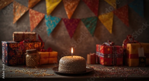 Celebratory sweet with lit candle in front of a wall decorated with colorful serpentine flags and wrapped presents