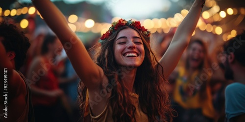event, dancing, woman, celebration, festival, live, music, string, light, summer, vibe, tank, top, floral, crown, casual attire, clothing, joyful, expression, raised, arm, social, gathering, attire, crowd, party, atmosphere, warm, weather, happy, summer, fun, band, accessory