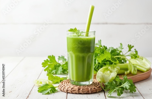 Celery green juice in glass on white background. Healthy drink for detox. Organic vegetable smoothie, fresh blended beverage on wooden table. Vegan food, diet eating. Freshness parsley, celery near