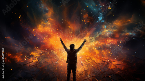 person, celebration, cosmic, fireworks, universe, joy, connection, spiritual, space, aethereal, abstract, vibrant, explosion, energy, interstellar, awe, stardust, mystical, grandeur, galactic