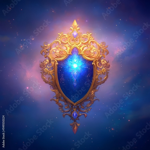 decoration, galaxy, art, glowing, light, power, emblem, shield, energy, divine, night, majestic, space, crystal, vibrant, awe, symbol, cosmic, gold, royals, dark, luxury, magical, graphic, fantasy, universe, protection, beauty, blue, aethereal, digital, shining, illustration, ornate, elegant, mystical, celestial, frame, spiritual, background, abstract, design, radiant, deep, wonder, sparkle, bright