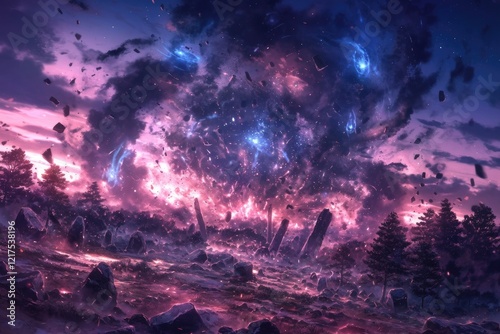 storm, celestial, forest, ruin, ancient, purple, pink, blue, night, sky, cloud, magical, mystical, fantasy, aethereal, cosmic, energy, power, explosion, destruction, rock, stone, tree, landscape, darkness, light, glowing, ember, spark, particle, swirling, chaos, vibrant, intense, dramatic, atmosphere, mysterious, wonder, surreal, artwork, digital, painting