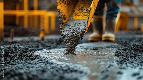 Cement work on site with construction worker mixing concrete, pouring into prepared form, smoothing surfaces, residential or commercial development, structural base forming