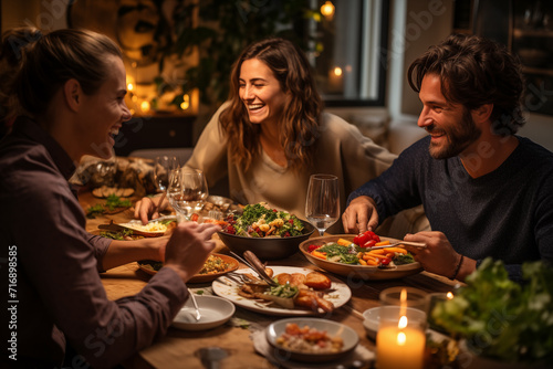 Cena de amigos en casa. Grupo de chicas y chicos riendo y disfrutando de la comida y de la compañia.