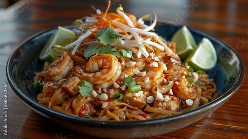 Central Thai Pad Thai, stirfried noodles with shrimp, tofu, and peanuts, garnished with lime wedges and fresh bean sprouts