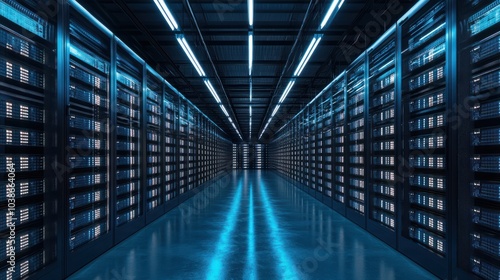 Centralized document management system with rows of digital archives for efficient storage, retrieval and distribution in a high-tech data center. HD image