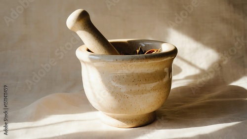 mortar, pestle, ceramic, pottery, beige, linen, fabric, natural, light, shadow, sunlight, texture, rustic, hand-made, kitchen utensile, cooking, spice, herb, preparation, culinary
