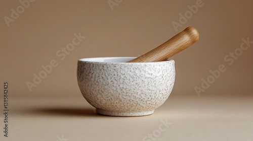 mortar, pestle, ceramic, wood, bowl, kitchen, cooking, spice, herb, grinder, tool, utensil, ingredient, food, preparation, texture, beige, background, studio, isolated, design, element, object, rustic, craft, hand-made, home, decor, white, brown, natural, healthy, culinary, equipment, appliance, contraption, device, instrument, supply, item, article, material