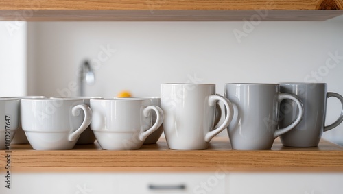 Ceramic mugs on a wooden kitchen shelf in a white-to-gray gradient, highlighting symmetry, minimalist style, and a cozy atmosphere for morning routine and everyday home life