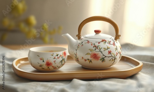 ceramic, teapot, teacup, floral, design, tray, tea, drink, porcelain, flower, dining, morning, cup, surface, tableware, display, quaint, peaceful, casual attire, warmth, artistic, beverage, kitchen, beautiful, aesthetic, cosy, relaxing, set, crafted, arrangement