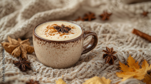 chai, latte, drink, beverage, spice, anise, cinnamon, hot drink, warm, cosy, autumn, fall, mug, cup, food, tea, sweet, dessert, knitted, blanket, star, favor, aroma, herb, seasoning, sugar, milk, closeup, still, life, table, indoor, delicious, refreshment, hot, comfort, wool, fabric, textile, decoration, yellow, leaf