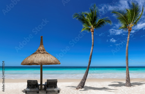 Chairs and umbrella in sunny tropical Palm Beach and turquoise sea. Summer vacation and tropical beach concept.