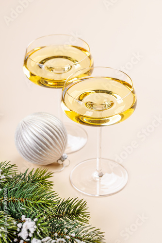 champaign, goggles, christmas, christmas, holiday, winter, snow, snowy, fir, pine, branch, beige, background, copy space, festive, celebration, drink, bubble, sparkle, toast, party, new year, greeting, postcard, elegant, cosy, warm, christmas card, sparkling, topview, seasonal, christmas tree, december, stylish, minimal, bauble