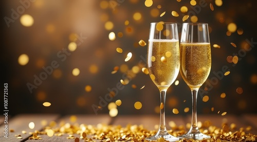 Champagne glasses with golden confetti and sparkling bubbles celebrating a festive occasion