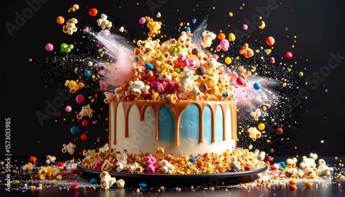 Chaos Cake Concept. Colorful cake explosion with popcorn and candies on a black background.