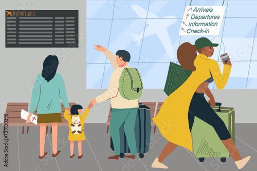 aerodrome, holiday maker, aeroplane, travel, baggage, vacation, plane, woman, interior, illustration, vector, man, cartoon, character, window, flat, person, modern, bag, suitcase, tour tourism, airline, hall, baggage, flight, transit, terminal, bench, scene, area, journey, departure, inside, international, lounge, passenger, sitting, trip, waiting, walk, aeroplane, aircraft, aviation, family, hand-drawn, look
