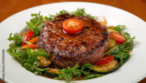 food, meat, salad, tomatoes, plate, steak, vegetable, spice, dinner, epicure, dish, grilled, roasted, beef, pork meat, lettuce, herb, cucumber, olive, arugula, rosemary, peppercorn, closeup, cooked, delicious, fresh