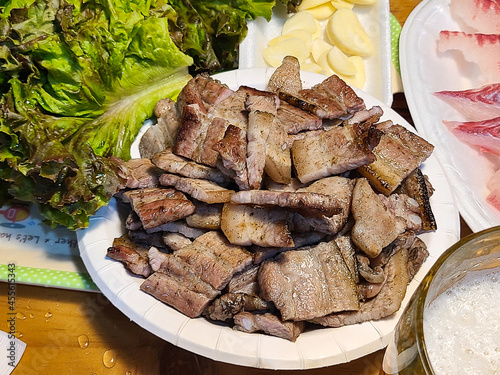 Charcoal-grilled pork belly and pork neck that I ate on vacation.