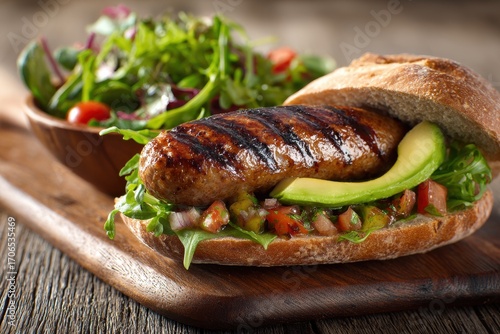 Char-Grilled Sausage on Crusty Bread with Fresh Avocado and a Vibrant Side Salad.