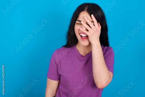 Charismatic carefree joyful young beautiful tattooed girl wearing purple t-shirt likes laugh out loud not hiding emotions giggling hear funny hilarious joke chuckling facepalm.