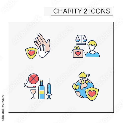 Charity color icons set. Drug and alcohol abuse, environment, child protection and advocacy charities. Volunteering concept. Isolated vector illustrations