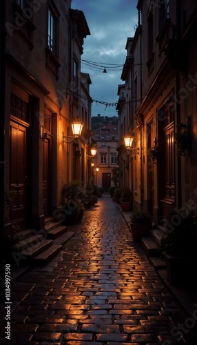 Charming alleyway with illuminated street lamps and wet cobblestones in twilight ambiance, nostalgic atmosphere
