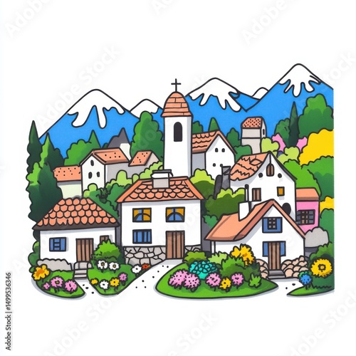 village, mountain, nature, landscape, house, tree, flower, sky, architecture, scenery, greenery, path, church, rooftop, pastoral, artistic, bright, tranquil, picturesque, spring, summer, rural, idylli, relaxation, travel, view, heritage, culture, traditional, colourful, vibrant, hill, elevation, environment, serene, leisure, vacation, get-away, beauty, destination, peaceful, scenic, joyful, exploration, cartoon, illustration