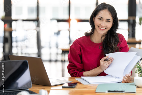 Charming Asian businesswoman working with paperwork and laptop computer to analyze business data and financial at office, smiling and looking at camera.