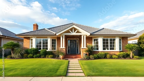 Charming Australian-style suburban home with a manicured lawn, bathed in natural daylight under a soft cloudy sky.