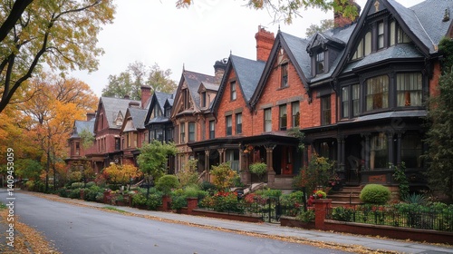 Charming autumn streetscape of historic brownstone homes in a vibrant neighborhood