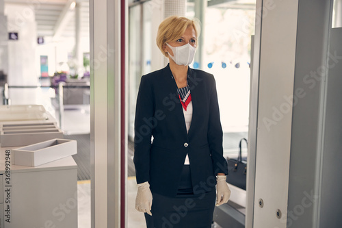 woman, aerodrome, passenger, adult, travel, gate, detector, scanner, metal, control, check, female, business, trip, terminal, holiday maker, journey, caucasian, travelling, voyage, tour tourism, lady, traveler, airline, businesswoman, departure, flight, indoor, disease, health, virus, medicals, mask, epidemic, pandemic, safety, protection, health care, security, checkpoint, inspection, boarding